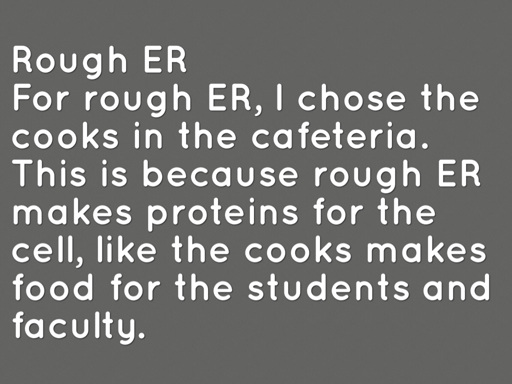 For rough ER, I chose the cooks in the cafeteria. This is because rough ER makes proteins for the cell, like the cooks makes food for the students and faculty.