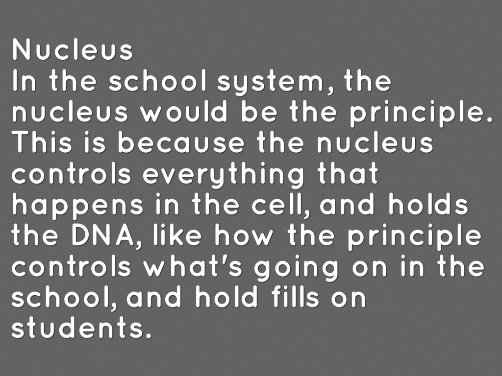 In the school system, the nucleus would be the principle. This is because the nucleus controls everything that happens in the cell, and holds the DNA, like how the principle controls what's going on in the school, and hold fills on students.