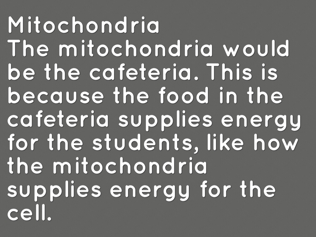 The mitochondria would be the cafeteria. This is because the food in the cafeteria supplies energy for the students, like how the mitochondria supplies energy for the cell.