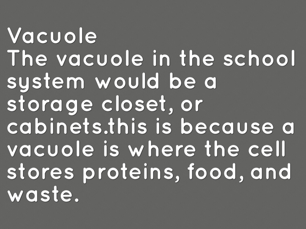The vacuole in the school system would be a storage closet, or cabinets.this is because a vacuole is where the cell stores proteins, food, and waste.