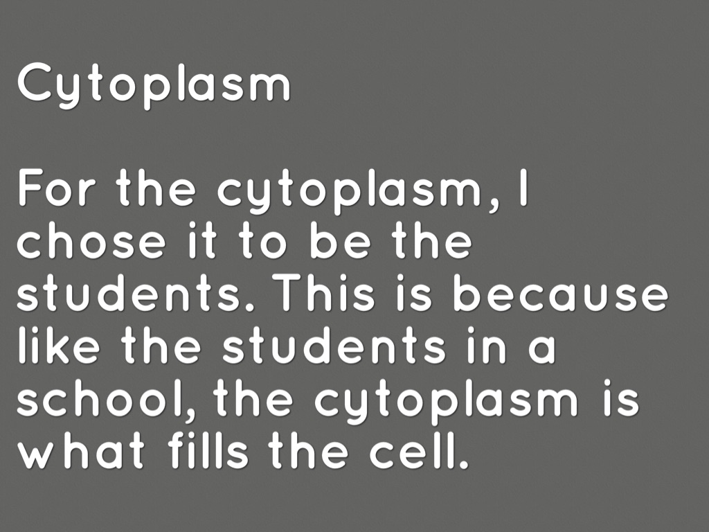 For the cytoplasm, I chose it to be the students. This is because like the students in a school, the cytoplasm is what fills the cell.