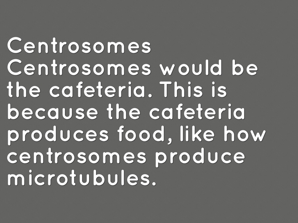 Centrosomes would be the cafeteria. This is because the cafeteria produces food, like how centrosomes produce microtubules.