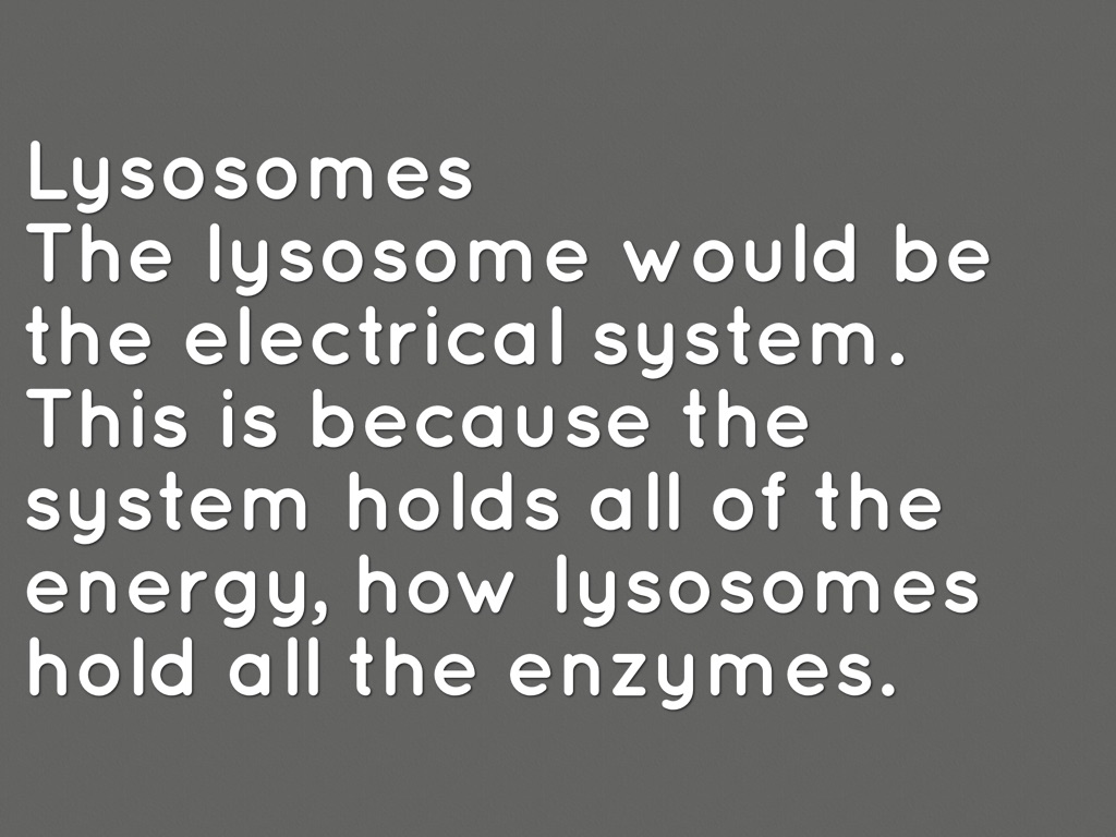 The lysosome would be the electrical system. This is because the system holds all of the energy, how lysosomes hold all the enzymes.