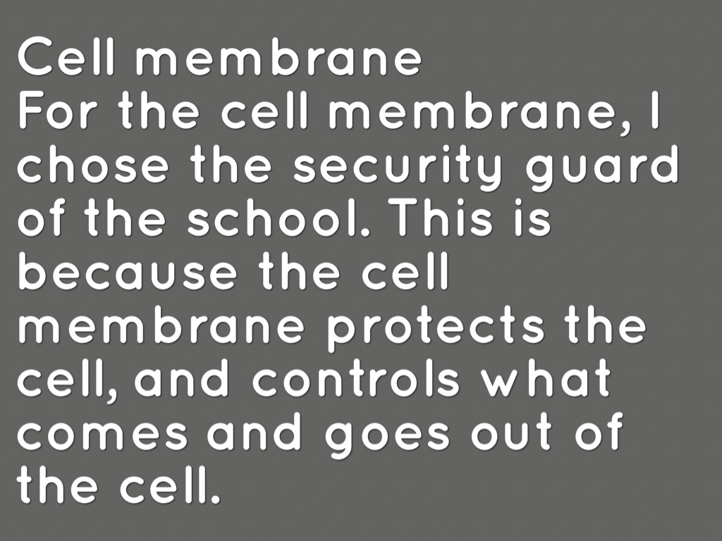 For the cell membrane, I chose the security guard of the school. This is because the cell membrane protects the cell, and controls what comes and goes out of the cell.