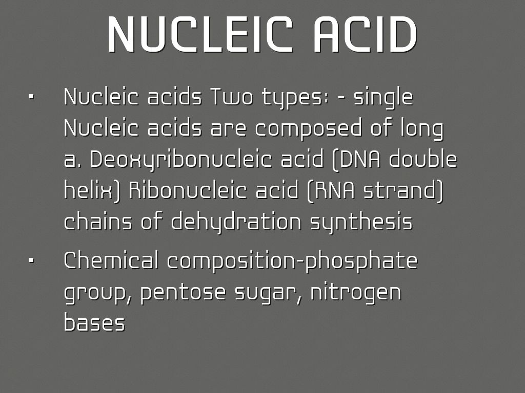 • Nucleic acids Two types: - single Nucleic acids are composed of long a. Deoxyribonucleic acid (DNA double helix) Ribonucleic acid (RNA strand) chains of dehydration synthesis