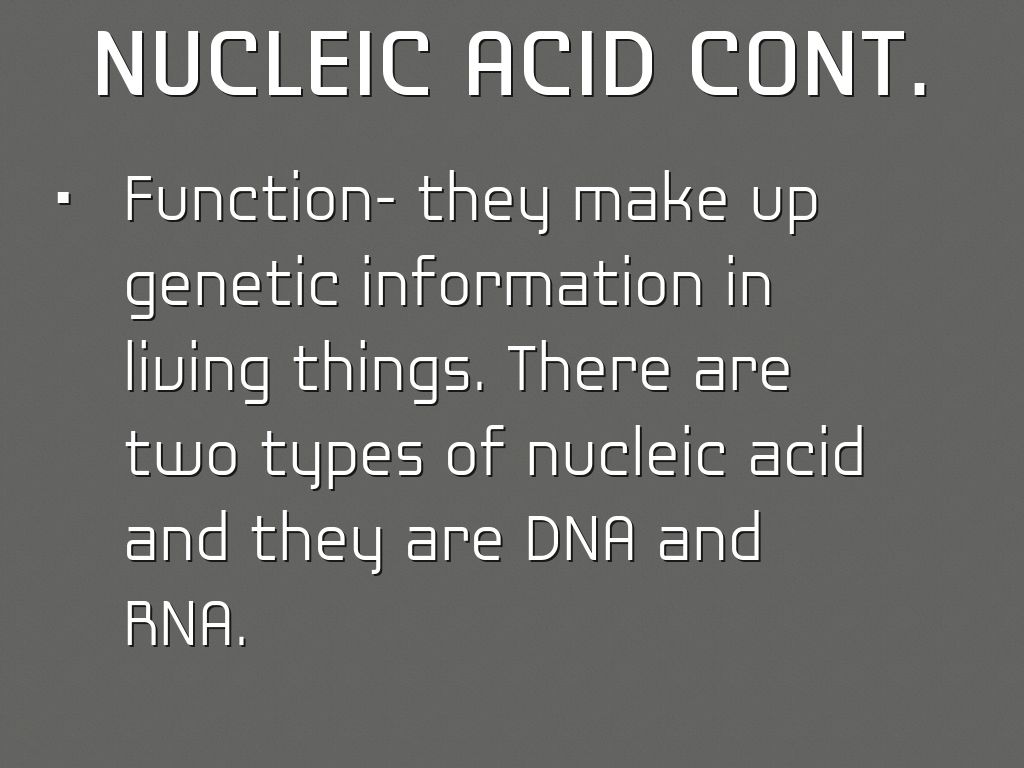 • Function- they make up genetic information in living things. There are two types of nucleic acid and they are DNA and RNA.