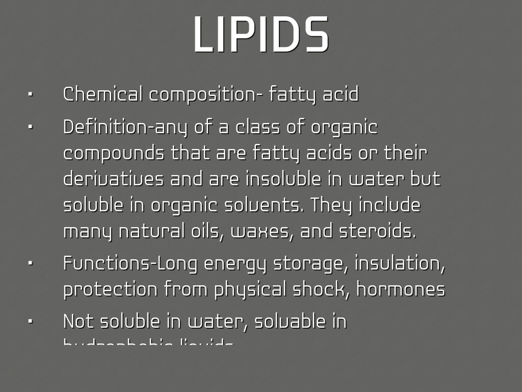 • Definition-any of a class of organic compounds that are fatty acids or their derivatives and are insoluble in water but soluble in organic solvents. They include many natural oils, waxes, and steroids.