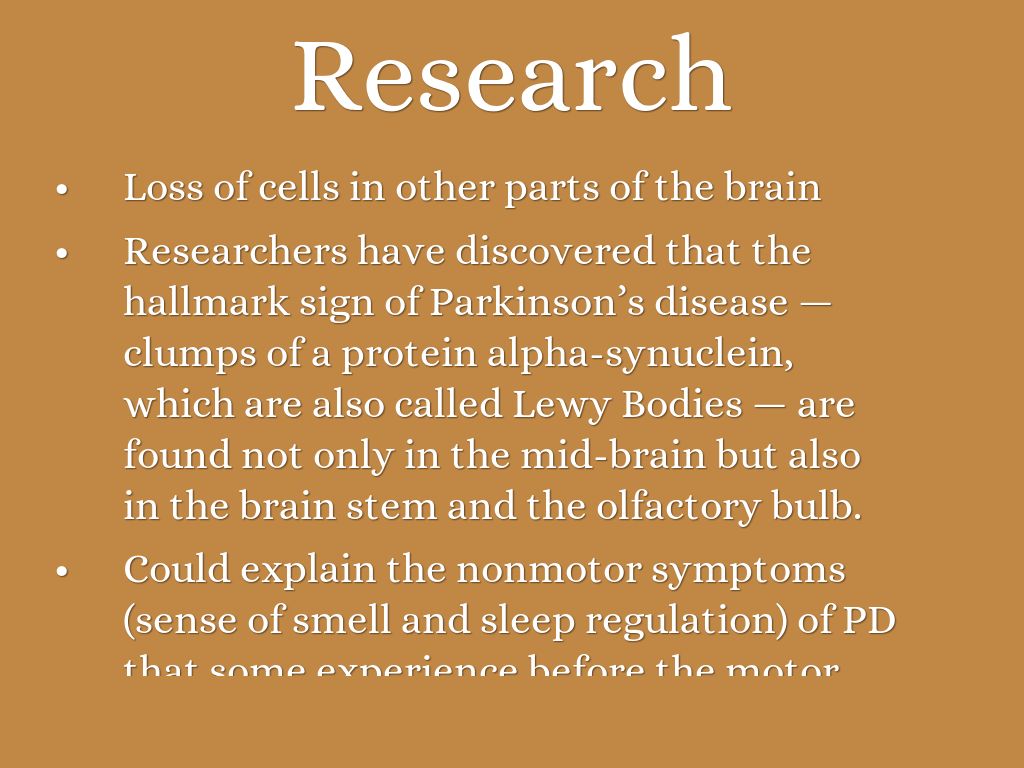 Researchers have discovered that the hallmark sign of Parkinson’s disease — clumps of a protein alpha-synuclein, which are also called Lewy Bodies — are found not only in the mid-brain but also in the brain stem and the olfactory bulb.