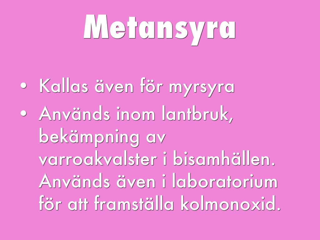 • Används inom lantbruk, bekämpning av varroakvalster i bisamhällen. Används även i laboratorium för att framställa kolmonoxid.