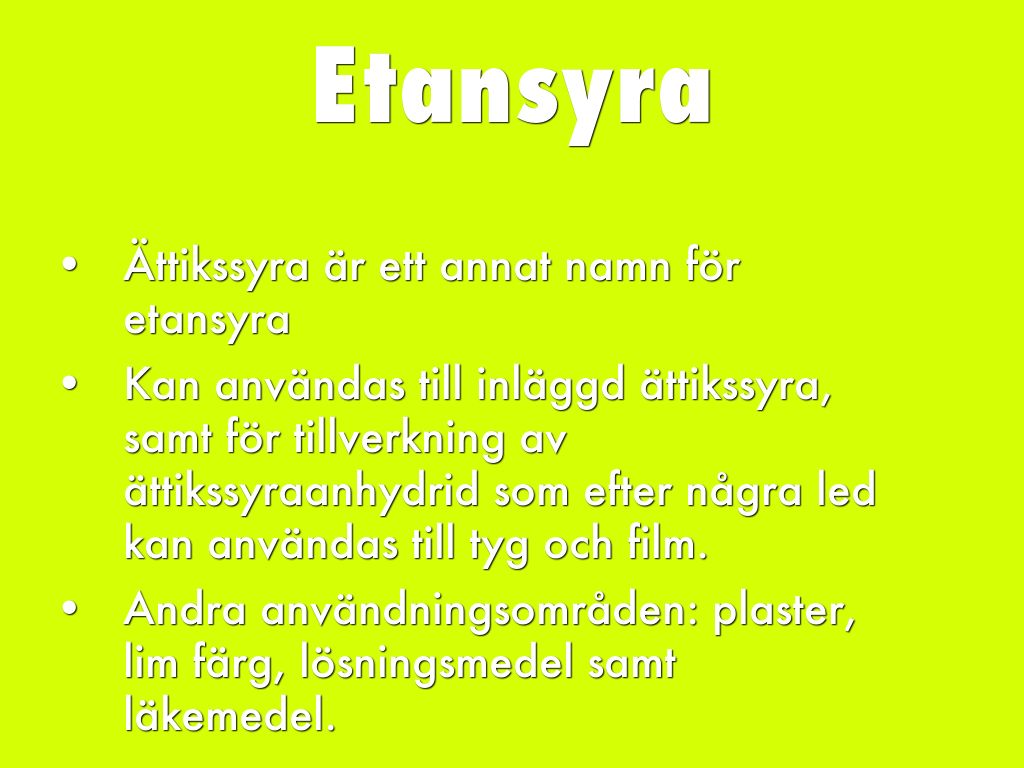 • Kan användas till inläggd ättikssyra, samt för tillverkning av ättikssyraanhydrid som efter några led kan användas till tyg och film.