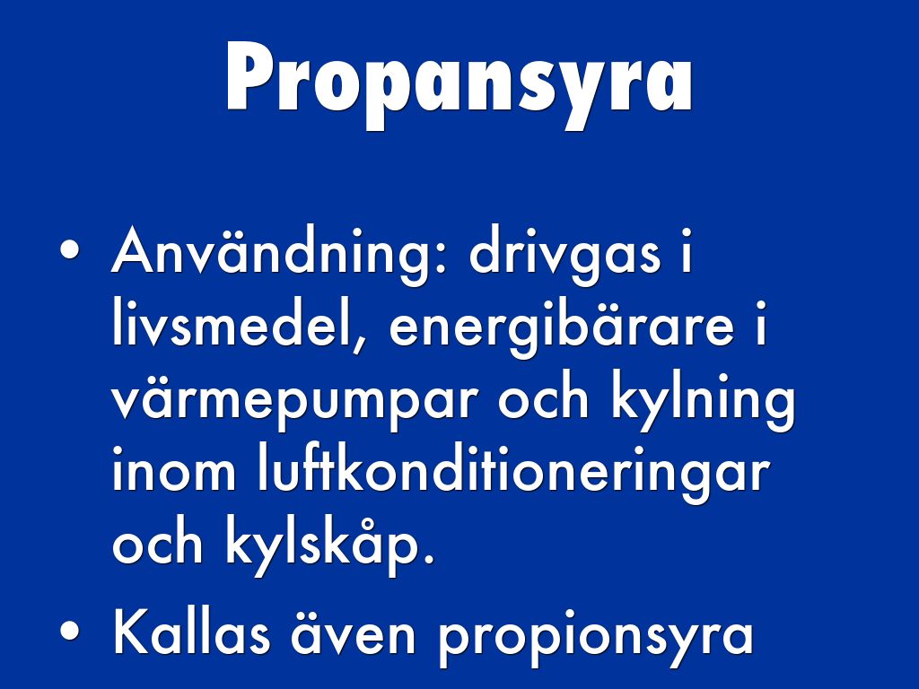 • Användning: drivgas i livsmedel, energibärare i värmepumpar och kylning inom luftkonditioneringar och kylskåp.