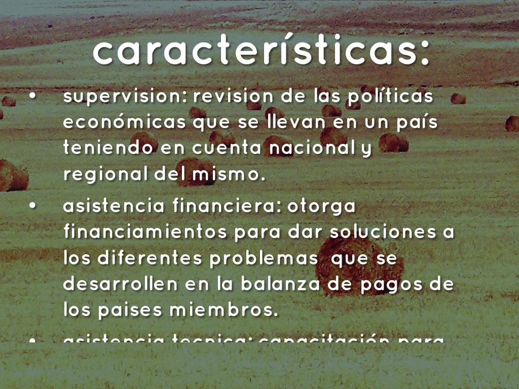 asistencia financiera: otorga financiamientos para dar soluciones a los diferentes problemas que se desarrollen en la balanza de pagos de los paises miembros.
