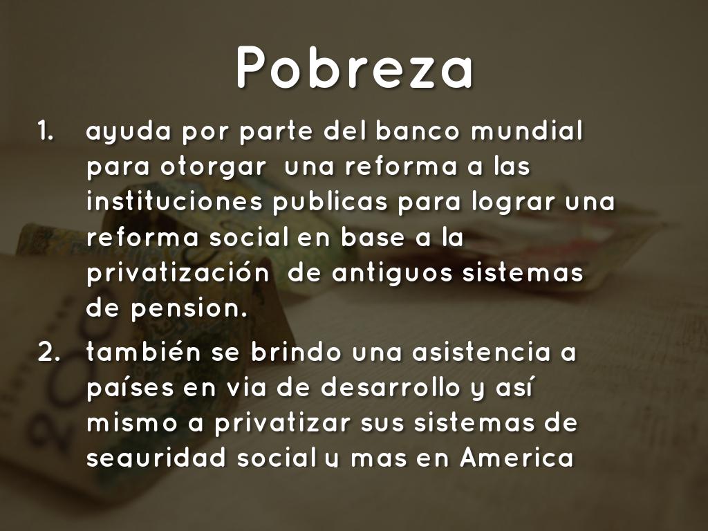 ayuda por parte del banco mundial para otorgar una reforma a las instituciones publicas para lograr una reforma social en base a la privatización de antiguos sistemas de pension.