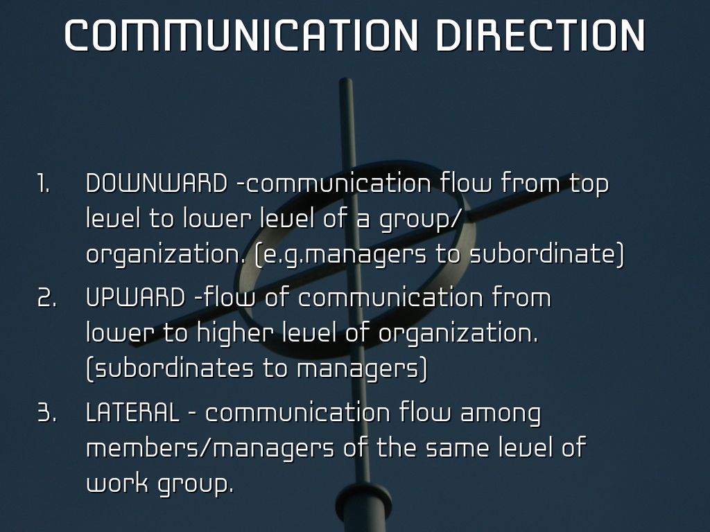 DOWNWARD -communication flow from top level to lower level of a group/ organization. (e.g.managers to subordinate)