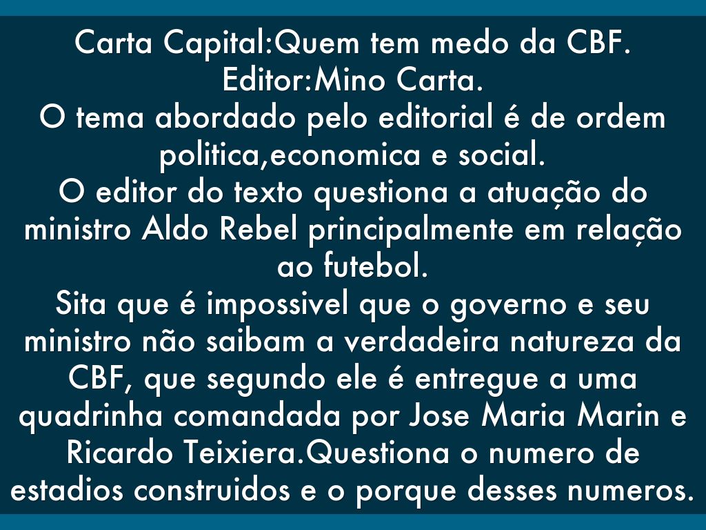 Sita que é impossivel que o governo e seu ministro não saibam a verdadeira natureza da CBF, que segundo ele é entregue a uma quadrinha comandada por Jose Maria Marin e Ricardo Teixiera.Questiona o numero de estadios construidos e o porque desses numeros.