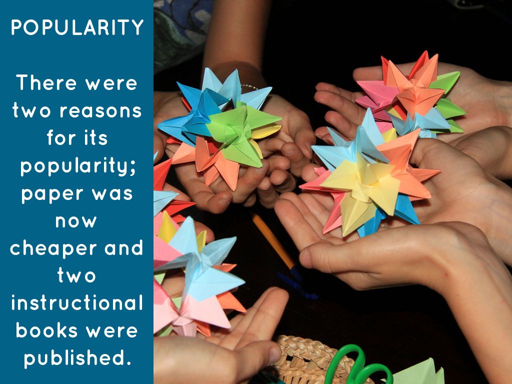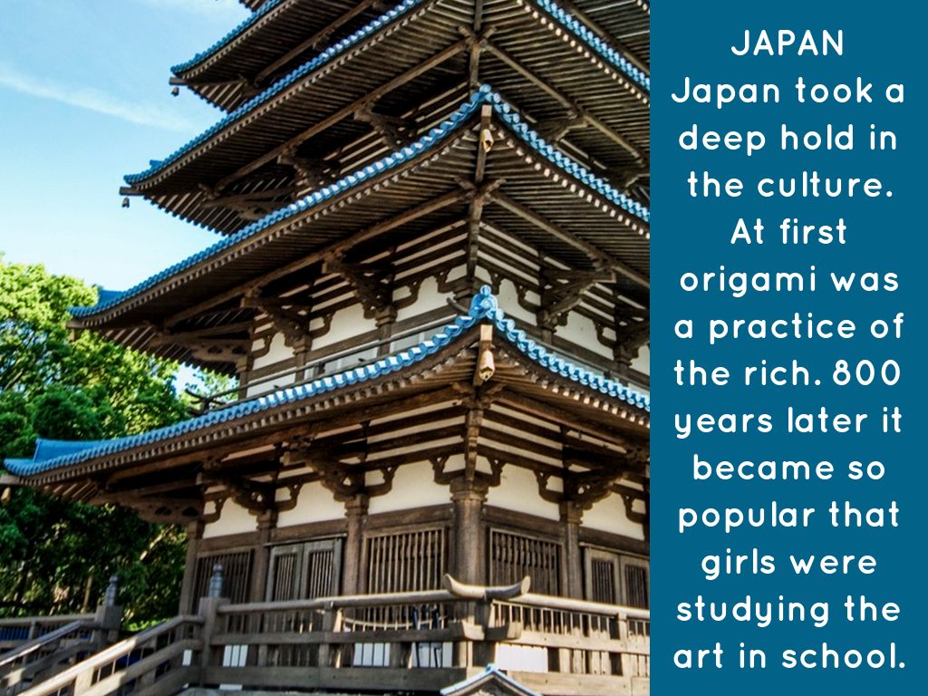 Japan took a deep hold in the culture. At first origami was a practice of the rich. 800 years later it became so popular that girls were studying the art in school.