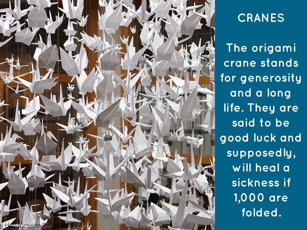 The origami crane stands for generosity and a long life. They are said to be good luck and supposedly, will heal a sickness if 1,000 are folded.