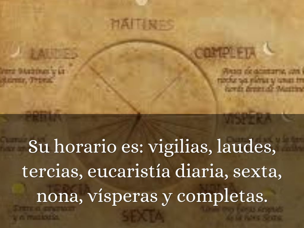 Su horario es: vigilias, laudes, tercias, eucaristía diaria, sexta, nona, vísperas y completas.