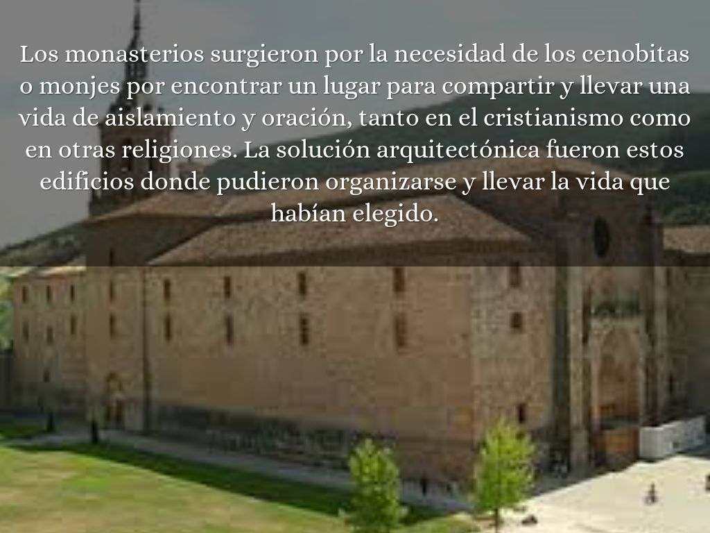 Los monasterios surgieron por la necesidad de los cenobitas o monjes por encontrar un lugar para compartir y llevar una vida de aislamiento y oración, tanto en el cristianismo como en otras religiones. La solución arquitectónica fueron estos edificios donde pudieron organizarse y llevar la vida que habían elegido.