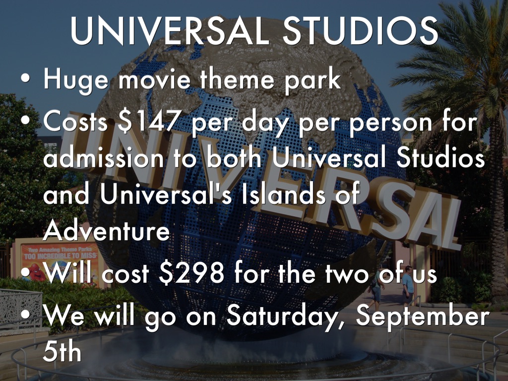 Costs $147 per day per person for admission to both Universal Studios and Universal's Islands of Adventure