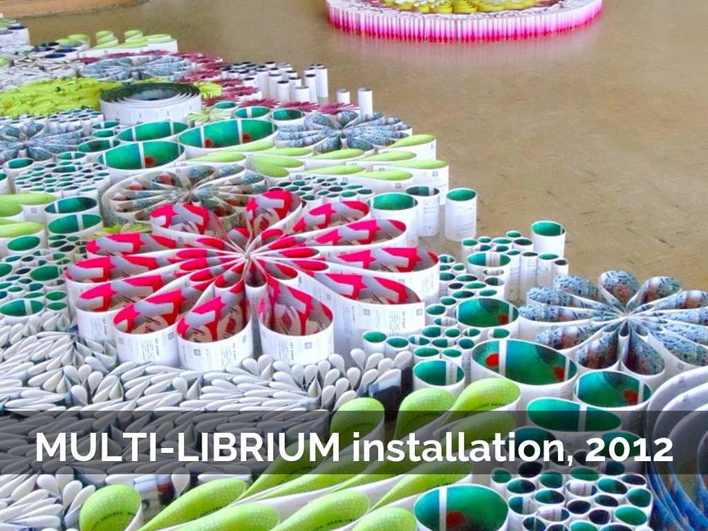 MULTI-LIBRIUM is a paper installation made up of more than 10,000 reused art invitations and measures 50 feet x 23 feet. It seeks to challenge preconceived notions of the traditional gallery space, delivering an engaging contemporary installation where the use of space is limited only to the floor. The installation examines and illustrates the concept of equilibrium in which all biological systems co-exist, survive and function, a concept that operates both on a cellular and exterior level. The installation compares, contrasts and balances art and science, and creates soft tension between the organic and geometric.