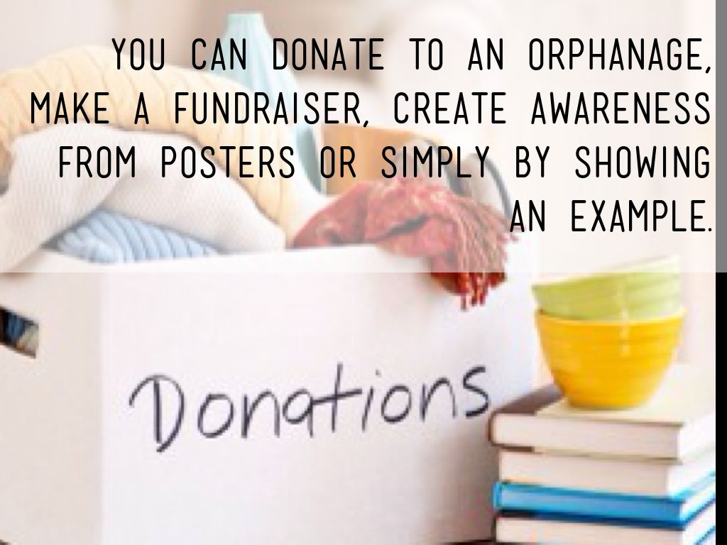 You can donate to an orphanage, make a fundraiser, create awareness from posters or simply by showing an example.