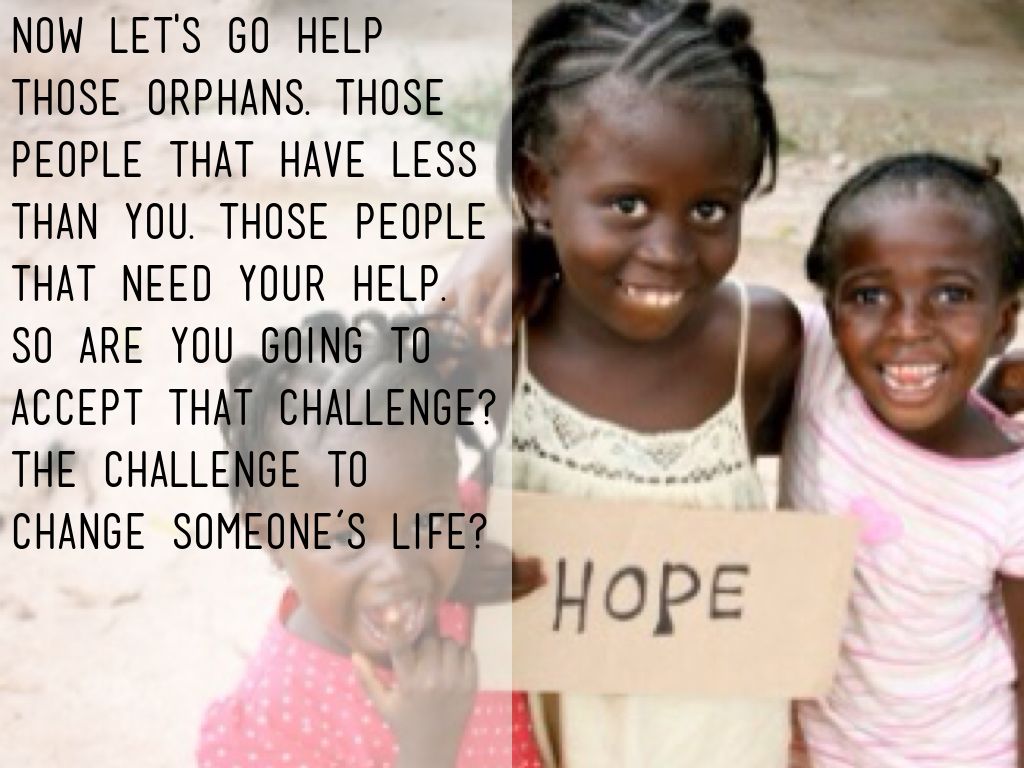 Now let's go help those orphans. Those people that have less than you. Those people that need your help. So are you going to accept that challenge? The challenge to change someone’s life?