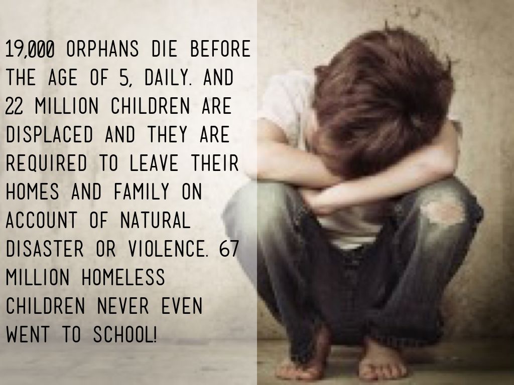 19,000 orphans die before the age of 5, daily. And 22 million children are displaced and they are required to leave their homes and family on account of natural disaster or violence. 67 million homeless children never even went to school!