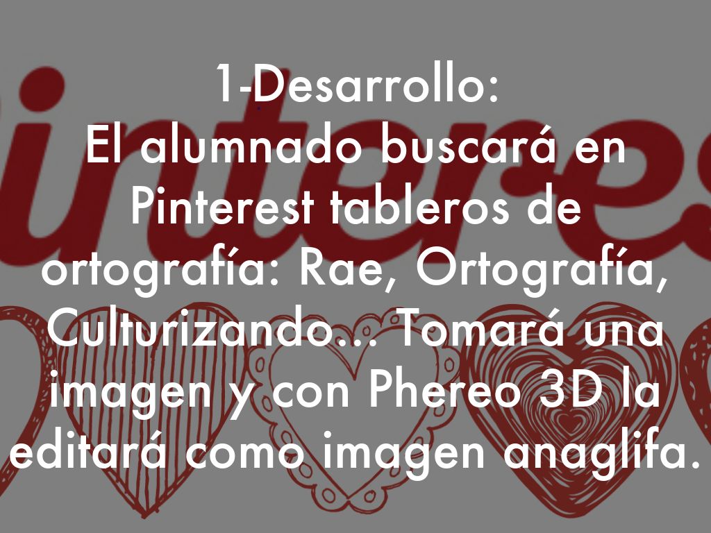 El alumnado buscará en Pinterest tableros de ortografía: Rae, Ortografía, Culturizando... Tomará una imagen y con Phereo 3D la editará como imagen anaglifa.