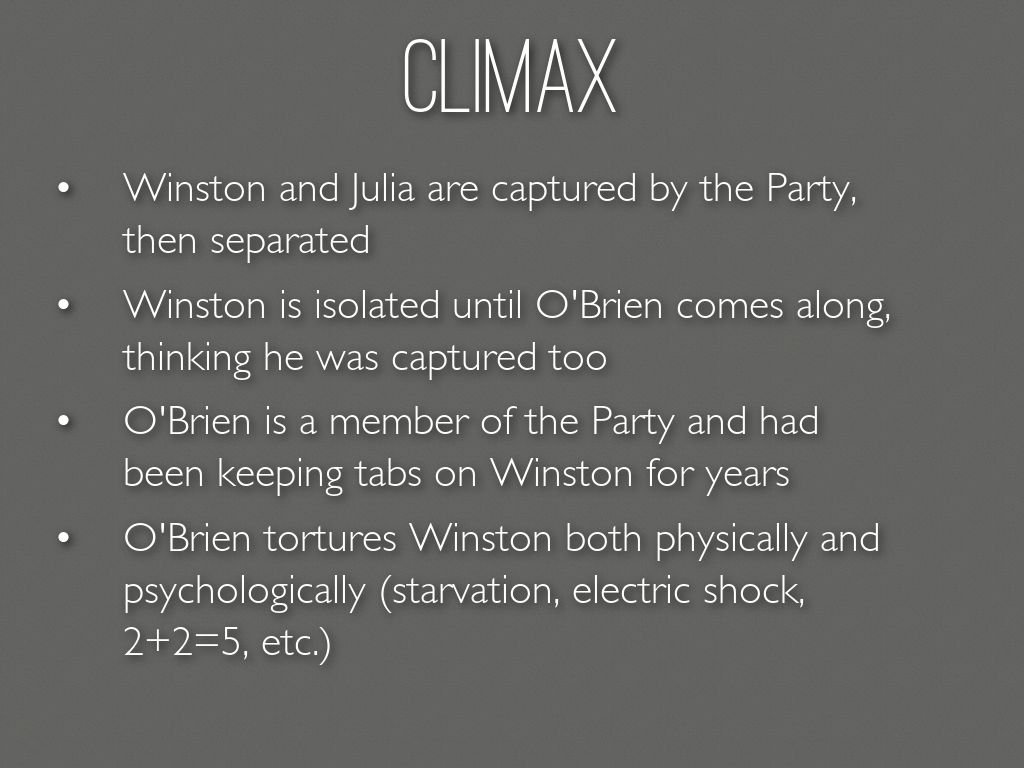 O'Brien tortures Winston both physically and psychologically (starvation, electric shock, 2+2=5, etc.)