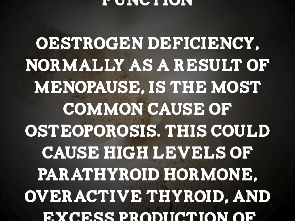 Oestrogen deficiency, normally as a result of menopause, is the most common cause of osteoporosis. This could cause high levels of parathyroid hormone, overactive thyroid, and excess production of cortisol.