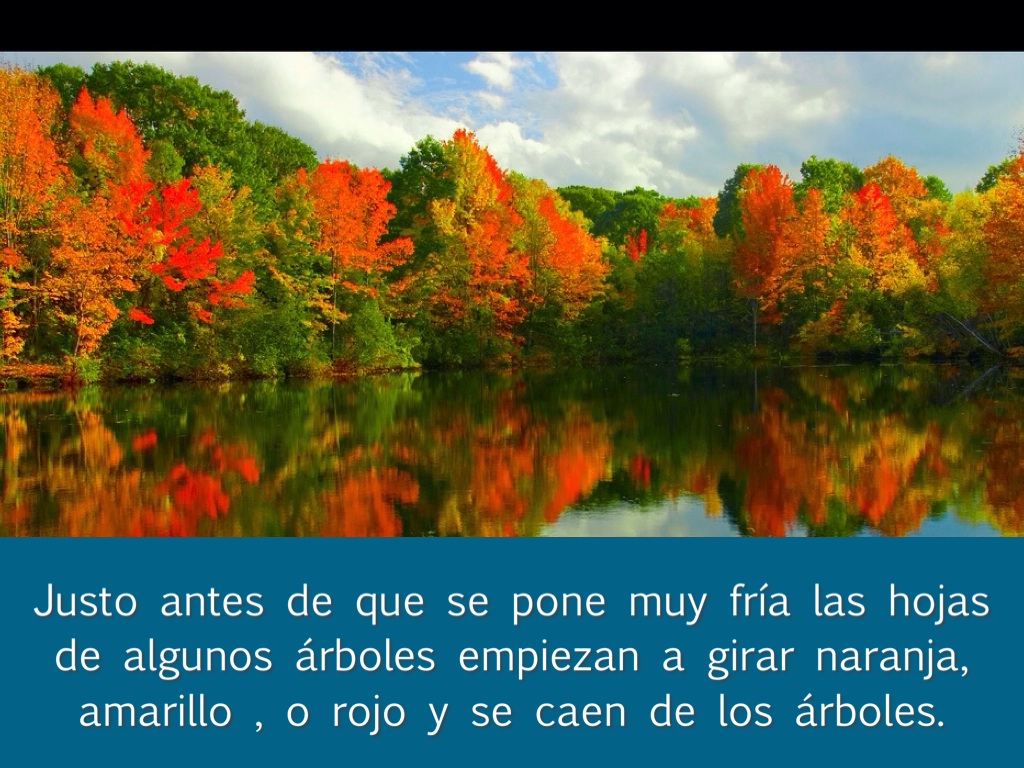 Justo antes de que se pone muy fría las hojas de algunos árboles empiezan a girar naranja, amarillo , o rojo y se caen de los árboles.