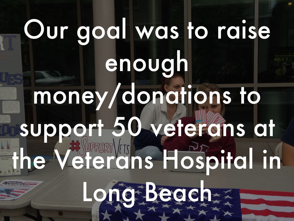 Our goal was to raise enough money/donations to support 50 veterans at the Veterans Hospital in Long Beach
