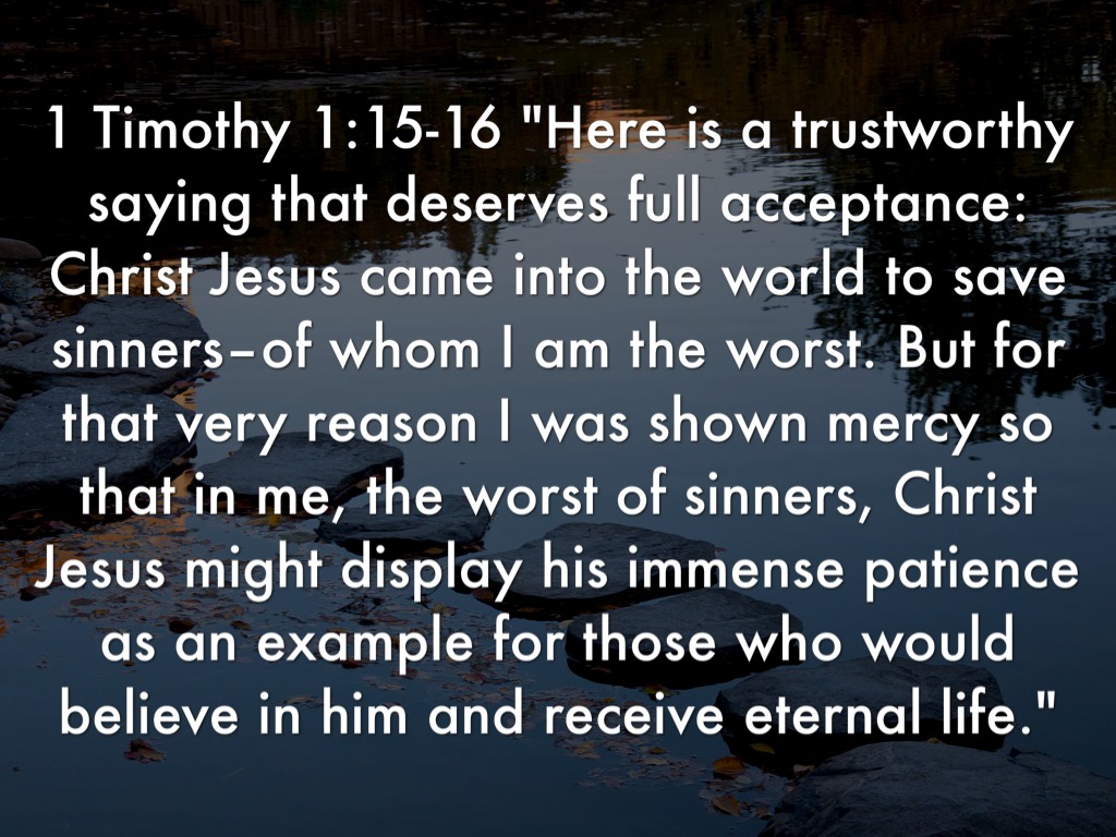 1 Timothy 1:15-16 "Here is a trustworthy saying that deserves full acceptance: Christ Jesus came into the world to save sinners–of whom I am the worst. But for that very reason I was shown mercy so that in me, the worst of sinners, Christ Jesus might display his immense patience as an example for those who would believe in him and receive eternal life."