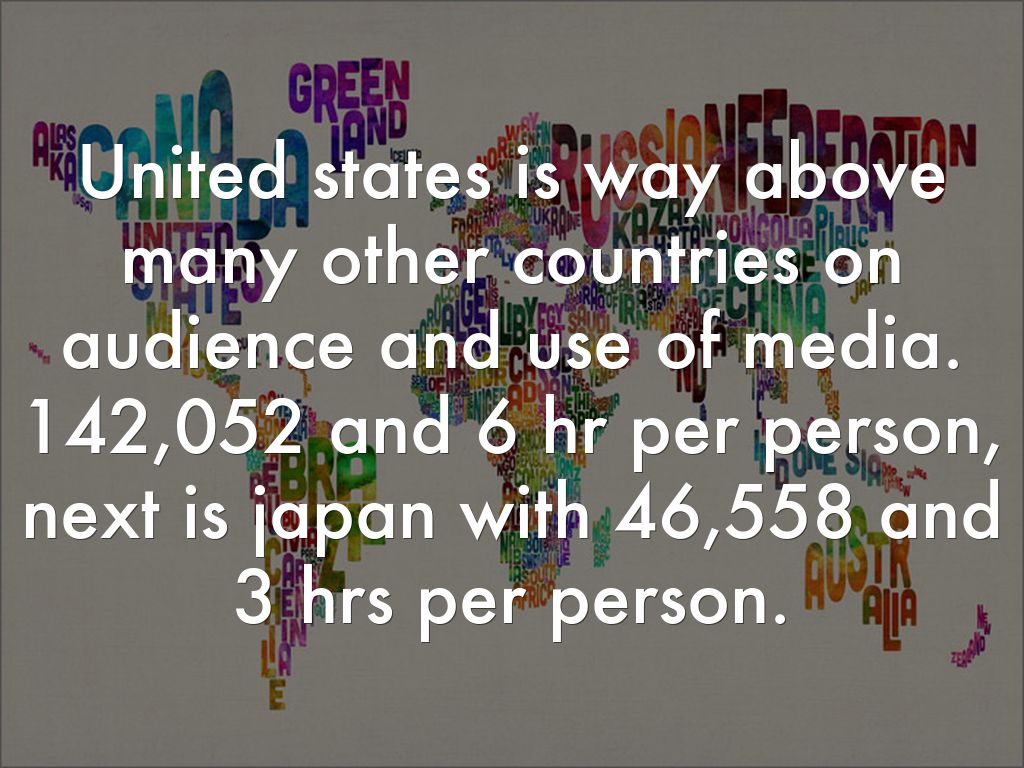 United states is way above many other countries on audience and use of media. 142,052 and 6 hr per person, next is japan with 46,558 and 3 hrs per person.