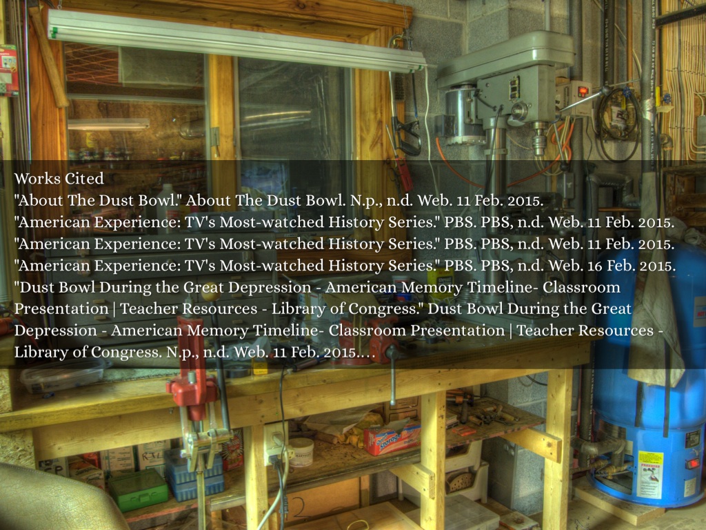"Dust Bowl During the Great Depression - American Memory Timeline- Classroom Presentation | Teacher Resources - Library of Congress." Dust Bowl During the Great Depression - American Memory Timeline- Classroom Presentation | Teacher Resources - Library of Congress. N.p., n.d. Web. 11 Feb. 2015.
