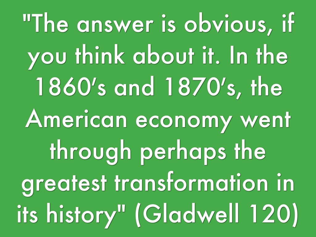 "The answer is obvious, if you think about it. In the 1860′s and 1870′s, the American economy went through perhaps the greatest transformation in its history" (Gladwell 120)