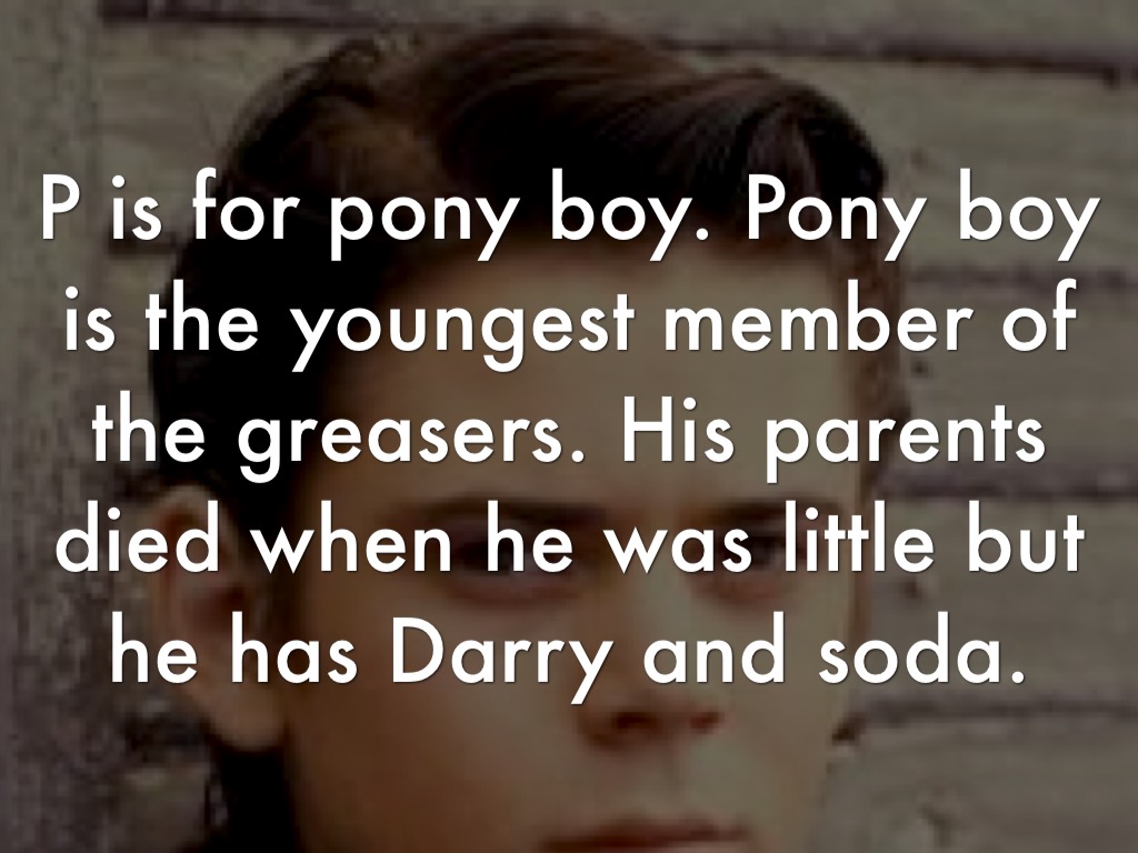 P is for pony boy. Pony boy is the youngest member of the greasers. His parents died when he was little but he has Darry and soda.