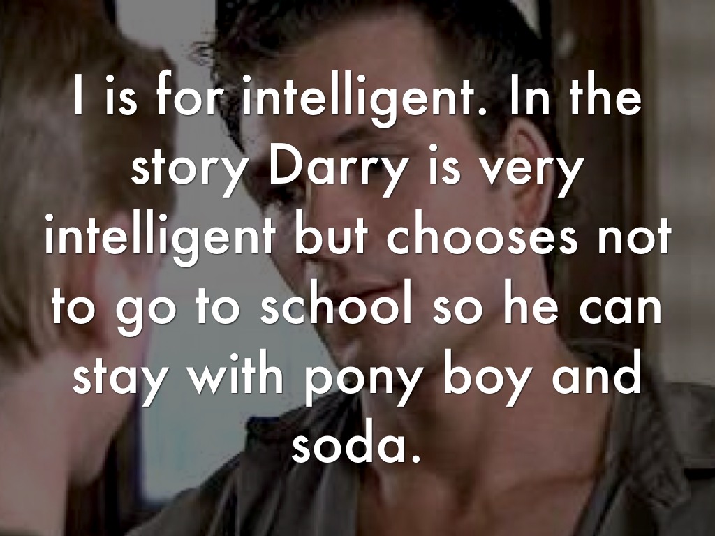 I is for intelligent. In the story Darry is very intelligent but chooses not to go to school so he can stay with pony boy and soda.
