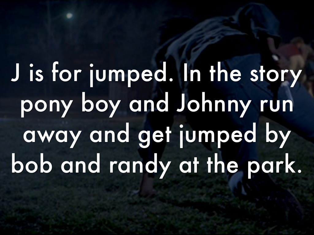 J is for jumped. In the story pony boy and Johnny run away and get jumped by bob and randy at the park.