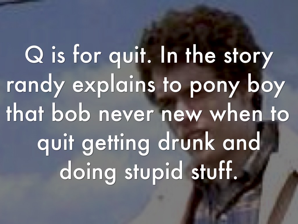 Q is for quit. In the story randy explains to pony boy that bob never new when to quit getting drunk and doing stupid stuff.