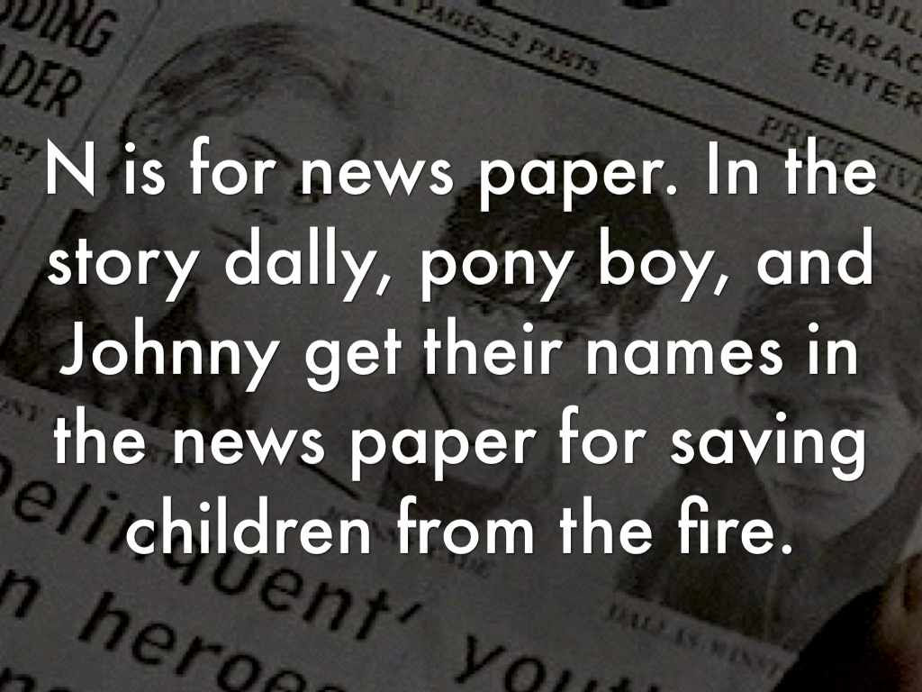 N is for news paper. In the story dally, pony boy, and Johnny get their names in the news paper for saving children from the fire.