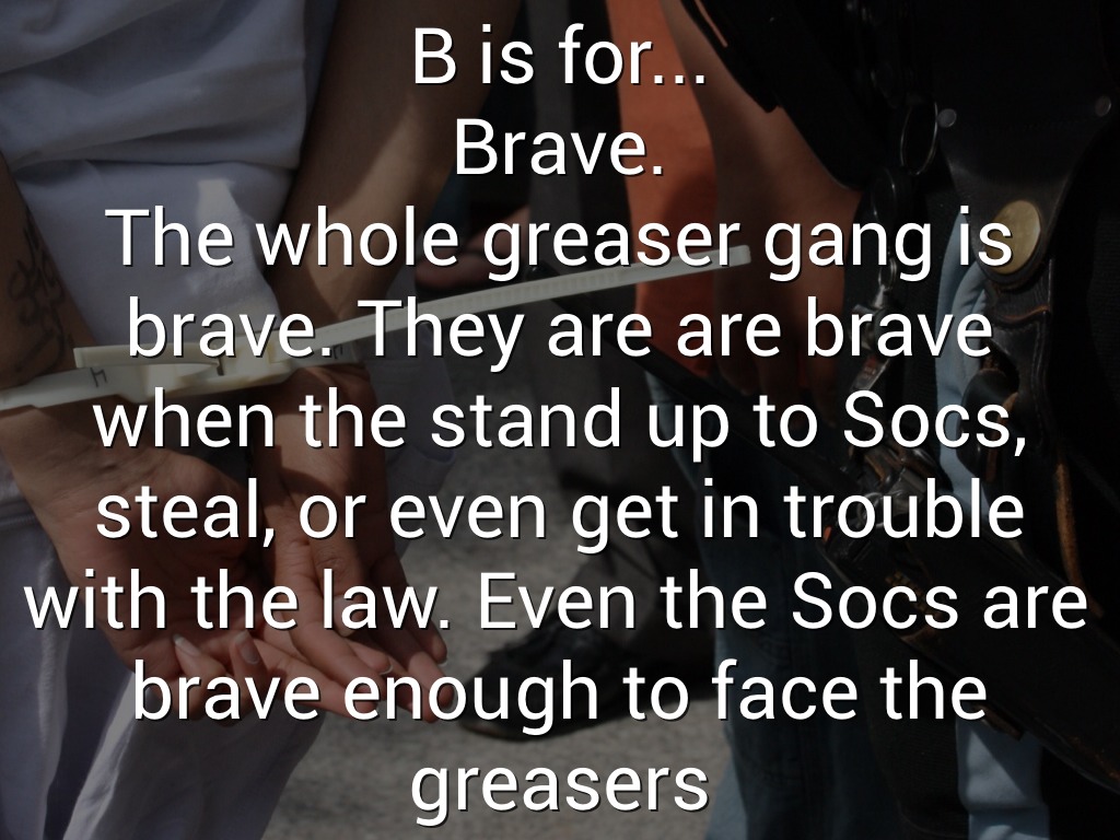 B is for... Brave. The whole greaser gang is brave. They are are brave when the stand up to Socs, steal, or even get in trouble with the law. Even the Socs are brave enough to face the greasers
