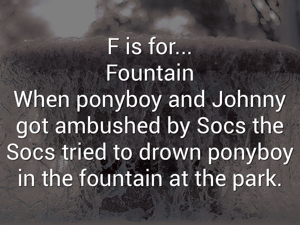 E is for... Educated. Ponyboy is by far the smartest one in the gang. Ponyboy gets As and Bs and is a very smart kid. The other guys in the gang...not so much.
