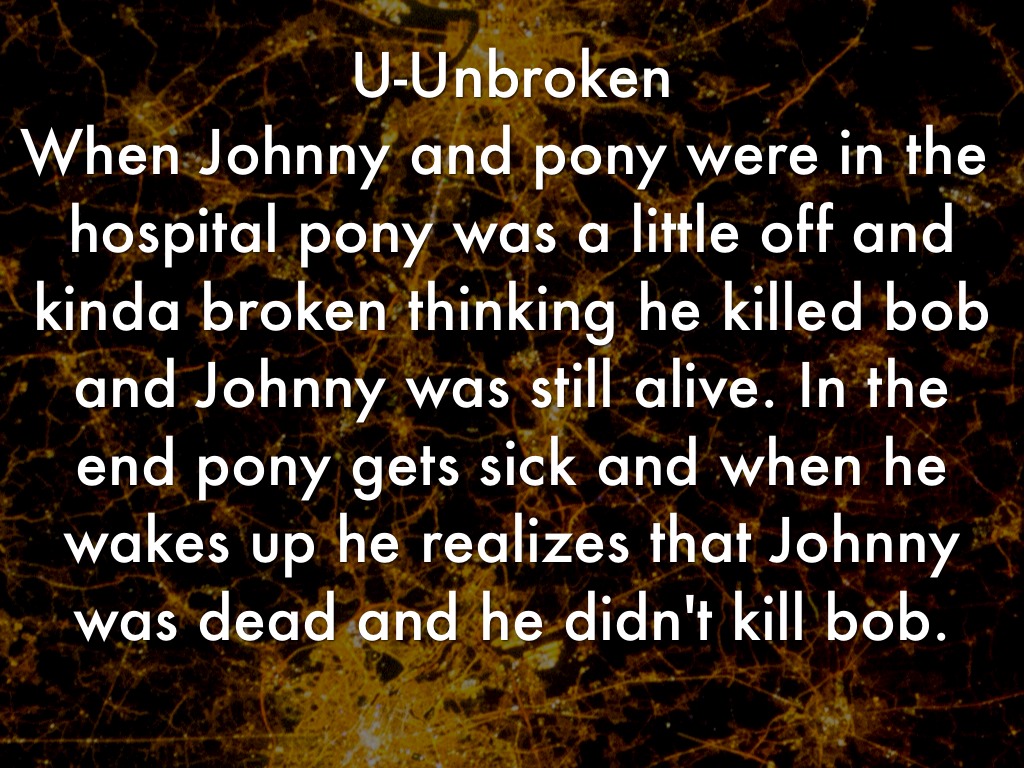 U-Unbroken When Johnny and pony were in the hospital pony was a little off and kinda broken thinking he killed bob and Johnny was still alive. In the end pony gets sick and when he wakes up he realizes that Johnny was dead and he didn't kill bob.
