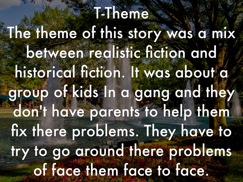 T-Theme The theme of this story was a mix between realistic fiction and historical fiction. It was about a group of kids In a gang and they don't have parents to help them fix there problems. They have to try to go around there problems of face them face to face.