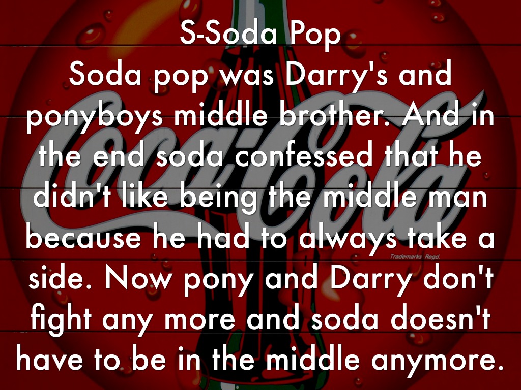 S-Soda Pop Soda pop was Darry's and ponyboys middle brother. And in the end soda confessed that he didn't like being the middle man because he had to always take a side. Now pony and Darry don't fight any more and soda doesn't have to be in the middle anymore.
