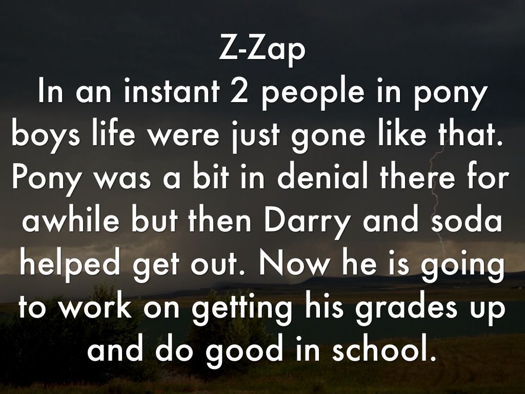 Z-Zap In an instant 2 people in pony boys life were just gone like that. Pony was a bit in denial there for awhile but then Darry and soda helped get out. Now he is going to work on getting his grades up and do good in school.