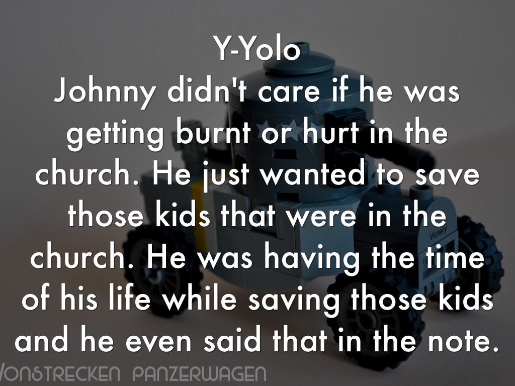 Y-Yolo Johnny didn't care if he was getting burnt or hurt in the church. He just wanted to save those kids that were in the church. He was having the time of his life while saving those kids and he even said that in the note.