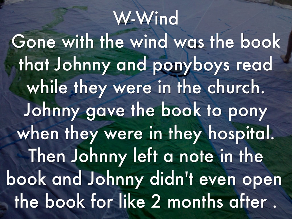 W-Wind Gone with the wind was the book that Johnny and ponyboys read while they were in the church. Johnny gave the book to pony when they were in they hospital. Then Johnny left a note in the book and Johnny didn't even open the book for like 2 months after .